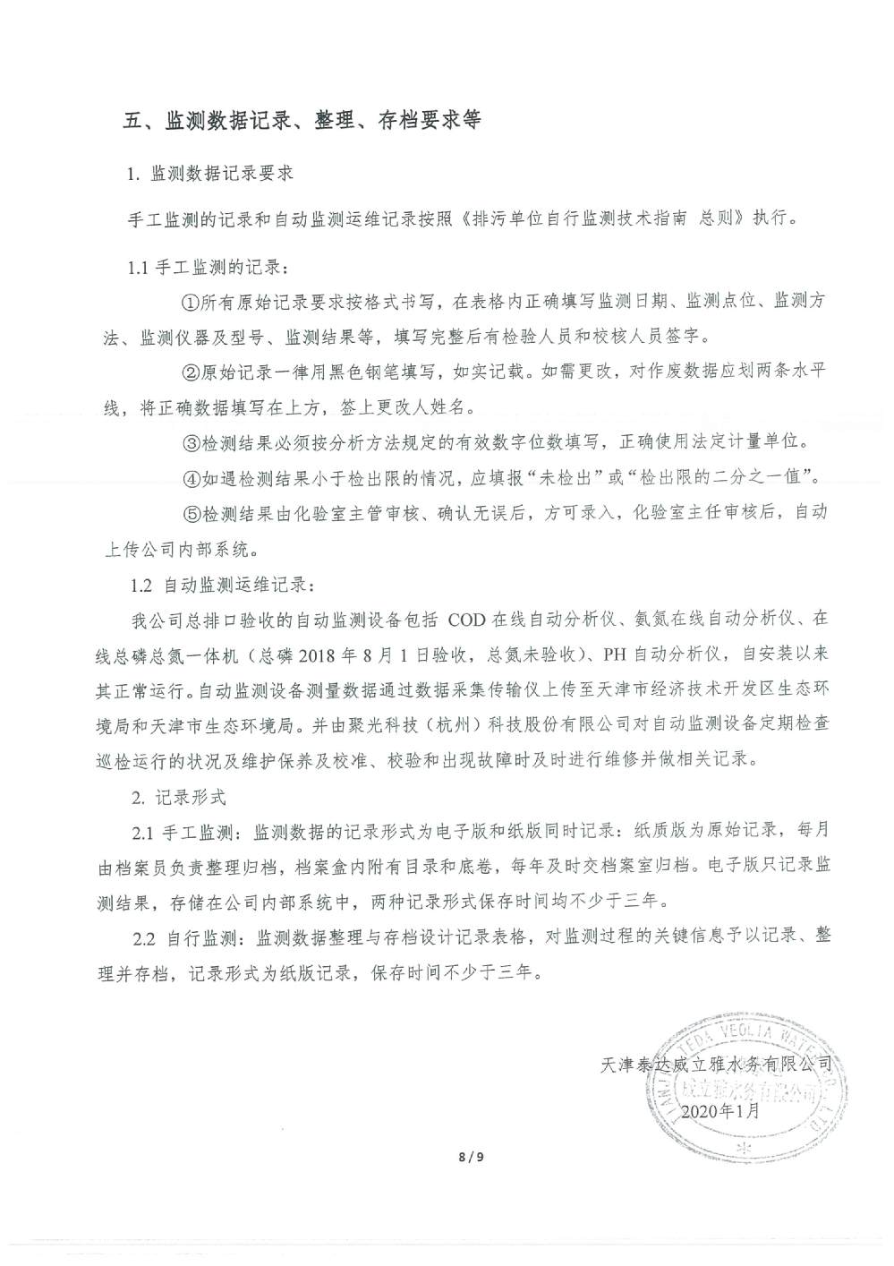 ? 公司出水指標(biāo)數(shù)據(jù)經(jīng)現(xiàn)場數(shù)據(jù)采集儀采集后直接上傳至天津開發(fā)區(qū)環(huán)保局及天津市環(huán)境監(jiān)測中心。天津市環(huán)境監(jiān)測中心直接將接收自公司的上傳數(shù)據(jù)發(fā)送至國家環(huán)保部。實現(xiàn)了對我公司出水指標(biāo)數(shù)據(jù)的實時在線監(jiān)控和監(jiān)督管理。 自2014年,依《國家重點監(jiān)控企業(yè)污染源監(jiān)督性監(jiān)測及信息公開辦法(試行)》,主要污染物排放情況經(jīng)天津市重點企業(yè)自行檢測數(shù)據(jù)發(fā)布系統(tǒng)對外公布,主動接受社會公眾監(jiān)督。 信息發(fā)布平臺 2025年第4季度環(huán)境信息公開:天津泰達(dá)威立雅水務(wù)有限公司 公司名稱:天津泰達(dá)威立雅水務(wù)有限公司 統(tǒng)一社會信用代碼:91120116663055985N 法定代表人:徐寶平 生產(chǎn)地址:天津經(jīng)濟(jì)技術(shù)開發(fā)區(qū)南海路188號 聯(lián)系電話:022-62018666 處理規(guī)模:10萬m3/日市政污水 生產(chǎn)經(jīng)營和管理服務(wù)的主要內(nèi)容: 水處理系統(tǒng)工程集成;城市污水處理、工業(yè)廢水處理、海水及苦咸水淡化處理;再生水、工業(yè)純水、水處理設(shè)備銷售;水處理設(shè)施運(yùn)營、管理及相關(guān)的設(shè)計、咨詢、技術(shù)服務(wù)。 其他信息: 天津泰達(dá)威立雅水務(wù)有限公司成立于2007年7月。天津泰達(dá)投資控股有限公司與法國通用-威立雅水務(wù)集團(tuán)各持股51%與49%。由天津經(jīng)濟(jì)技術(shù)開發(fā)區(qū)管理委員會公用事業(yè)局授權(quán),天津泰達(dá)威立雅水務(wù)有限公司負(fù)責(zé)開發(fā)區(qū)第一污水處理廠及其附屬設(shè)施、海晶東雨污水泵站、開發(fā)區(qū)電鍍廢水處理中心的運(yùn)營、維護(hù)保養(yǎng)及經(jīng)營。 項目(出水) 平均值(mg/L) A標(biāo)準(zhǔn)(DB12/599-2015) (mg/L) 化驗次數(shù)(次) 合格率(%) 我公司排放口數(shù)量為一個,位于廠區(qū)東南側(cè)。處理后出水排入市政專用排污管道,經(jīng)北排泵站排入渤海灣。2025年10-12月我公司COD、氨氮、總氮、總磷排放總量如下: 146.53 天津泰達(dá)威立雅水務(wù)有限公司為原天津經(jīng)濟(jì)技術(shù)開發(fā)區(qū)污水處理廠,是天津濱海新區(qū)第一座污水處理廠,位于開發(fā)區(qū)南海路與第十二大街交口處,污水處理項目投資總額3.5534億元人民幣,占地8.1公頃,設(shè)計能力為日處理污水10萬m3,其中市政污水的比例高于60%。污水處理工藝目前采用“預(yù)處理+SBR+反硝化濾池+臭氧催化高級氧化+紫外消毒”。脫水機(jī)房、進(jìn)水泵房、預(yù)處理單元和儲泥池的臭氣經(jīng)過收集管道收集進(jìn)入生物過濾塔除臭處理。剩余污泥經(jīng)脫水機(jī)脫水處理,泥餅外運(yùn)處理。工藝系統(tǒng)由在線儀器儀表輸送到中控室實現(xiàn)自動控制。 出水水質(zhì)達(dá)到天津市《城鎮(zhèn)污水處理廠污染物排放標(biāo)準(zhǔn)》(DB12/599-2015)A排放標(biāo)準(zhǔn)。廠界噪聲均滿足《工業(yè)企業(yè)廠界噪聲標(biāo)準(zhǔn)》GB12348-2008(3類)晝、夜標(biāo)準(zhǔn)值。廠界無組織排放廢氣中臭氣濃度、氨、硫化氫濃度均符合《惡臭污染物排放標(biāo)準(zhǔn)》(GB12/059-2018)限值要求。 開發(fā)區(qū)第一污水處理廠現(xiàn)狀主要的大氣影響來自預(yù)處理單元(格柵與沉砂池)和污泥區(qū)(污泥脫水機(jī)房)的惡臭氣體。污泥脫水機(jī)房、污泥料倉、三合一泵房等設(shè)施產(chǎn)生的臭氣集中收集,儲泥池、預(yù)處理單元等采用加罩密閉設(shè)計,臭氣集中收集至生物除臭裝置,除臭效率不低于80%,處理后由15米高排氣筒達(dá)標(biāo)排放。根據(jù)天津市環(huán)保局《關(guān)于天津開發(fā)區(qū)第一污水處理廠改造工程環(huán)境影響報告書的批復(fù)》,開發(fā)區(qū)第一污水處理廠的衛(wèi)生防護(hù)距離設(shè)為100m。 污水廠廢氣監(jiān)測結(jié)果表明,廠區(qū)周界監(jiān)測點位臭氣濃度均低于20(無量綱),符合《惡臭污染物排放標(biāo)準(zhǔn)(GB12/059-2018)的標(biāo)準(zhǔn)要求。 開發(fā)區(qū)第一污水處理廠污水經(jīng)處理后達(dá)到天津市《城鎮(zhèn)污水處理廠污染物排放標(biāo)準(zhǔn)》(DB12/599-2015)A排放標(biāo)準(zhǔn)要求。污水處理廠工藝過程本身沒有生產(chǎn)性廢水排放,所排污水主要為生活污水和污泥處理水,這部分廢水一同返回本污水處理廠的進(jìn)水泵房,與市政污水一并處理。2025年10-12月出水達(dá)標(biāo)率為100%,無超標(biāo)情況。 開發(fā)區(qū)第一污水處理廠主要的噪聲設(shè)備為鼓風(fēng)機(jī),鼓風(fēng)機(jī)位于鼓風(fēng)機(jī)房,并設(shè)置隔音減震措施,其噪聲影響甚微。 監(jiān)測結(jié)果:廠界噪聲共設(shè)置4個噪聲監(jiān)測點,執(zhí)行《工業(yè)企業(yè)廠界環(huán)境噪聲排放標(biāo)準(zhǔn)》(GB12348-2008)3類標(biāo)準(zhǔn),根據(jù)監(jiān)測結(jié)果,各廠界處噪聲均符合執(zhí)行標(biāo)準(zhǔn)要求。 污水廠運(yùn)行過程中產(chǎn)生的固體廢棄物主要為柵渣、沉砂、污泥及生活垃圾。生活垃圾和柵渣交由開發(fā)區(qū)環(huán)衛(wèi)綜合服務(wù)公司清運(yùn)處理;產(chǎn)生的脫水污泥委托天津恒基環(huán)境工程有限公司和天津萬德生物工程有限公司進(jì